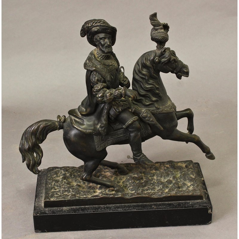 A BRONZE FIGURE OF A NOBLEMAN ON HORSE BACK,