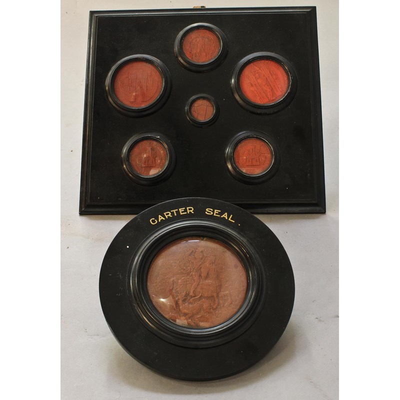 the 11cm Garter seal in red wax with original cord suspension visible, mounted in an ebonised circular frame glazed to either side, 21.5cm and a collection of six red wax document seals, mounted in a rectangular ebonised framed, one seal glazed to both sides, 32 x 35cm.