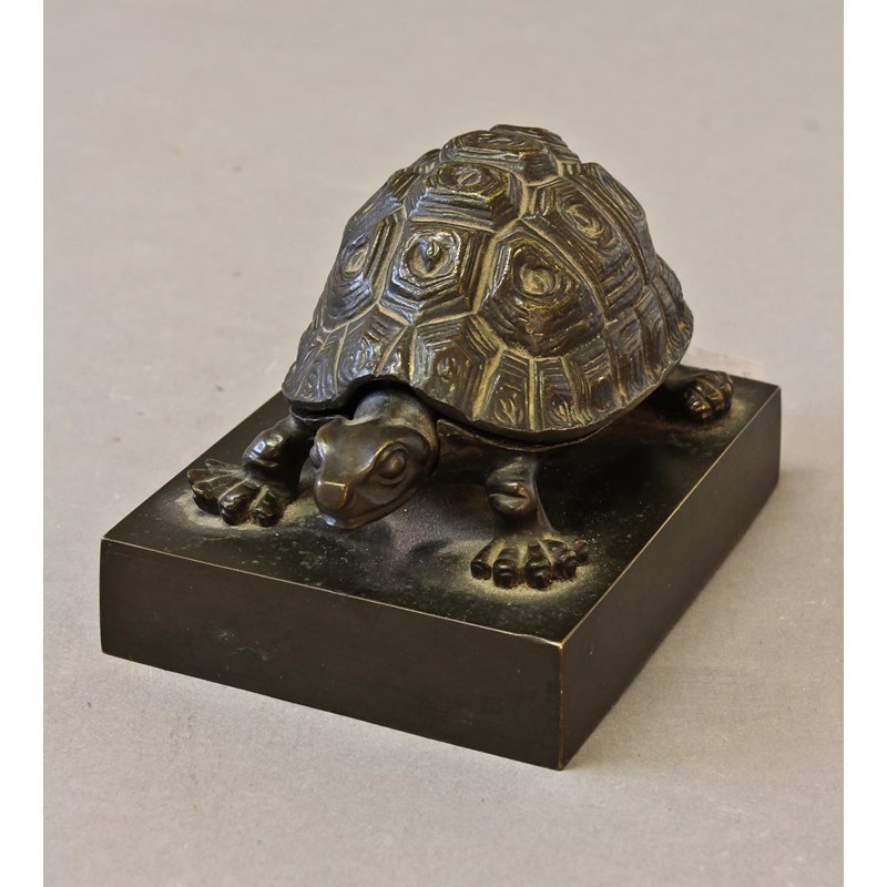 AN EARLY VICTORIAN BRONZE INK WELL IN THE FORM OF A TORTOISE, the naturalistic shell sprung to reveal an inkwell, the mechanism triggered by depressing the head, on a rectangular base, 8.5cm high, 13cm wide.