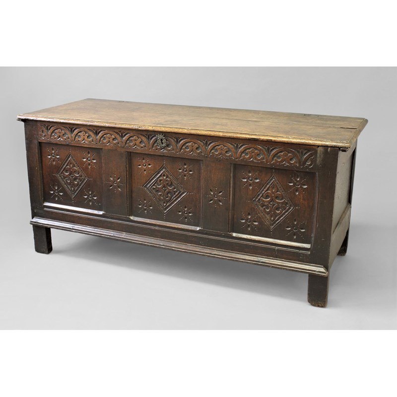 A 17TH CENTURY OAK COFFER, with a two plank top above a three panel front with carved lozenge decoration and a frieze of running lunettes, above an applied moulding, 66cm high, 148cm wide.