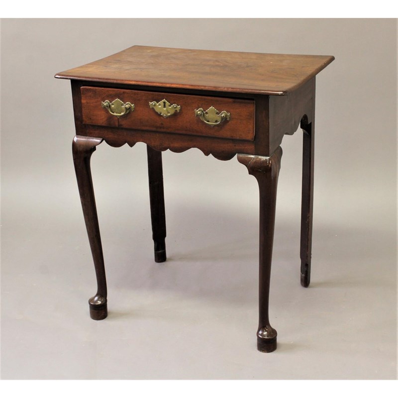 the rectangular top with rounded corners above a single frieze drawer with brass handles and key escutcheon, above a wavy frieze, on slender cabriole legs and pad feet, 71cm high 63cm wide.