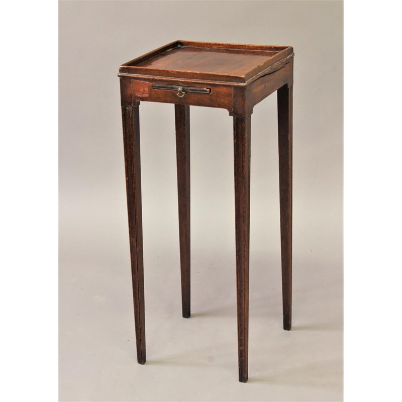 the square top with raised border above a small slide, on square tapering and slightly splayed moulded legs, 68cm high 28cm wide.