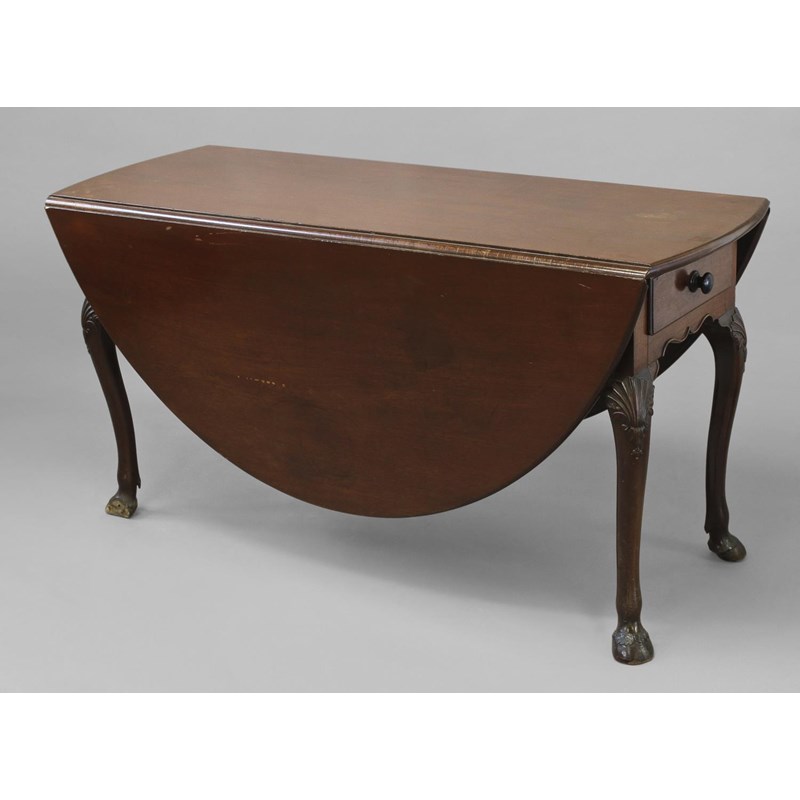 A GEORGE II IRISH MAHOGANY GATELEG DINING TABLE, the broad oval top above twin frieze drawers, on decorative cabriole legs with shell carved knees and hoof feet. 72cm high, 140cm wide.