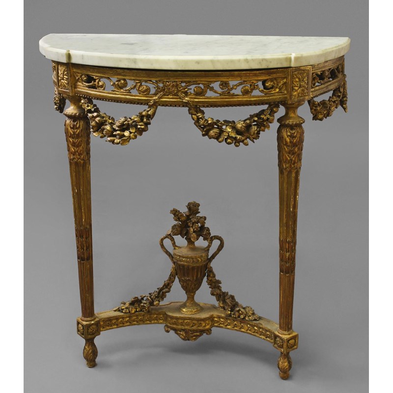the 'D' shaped white marble top on a carved and gilt frieze with pierced scrolling decoration, with twin turned, carved and tapering stop-fluted legs and a stretcher mounted with a flowering vase of flowers, 85cm high, 80cm wide.