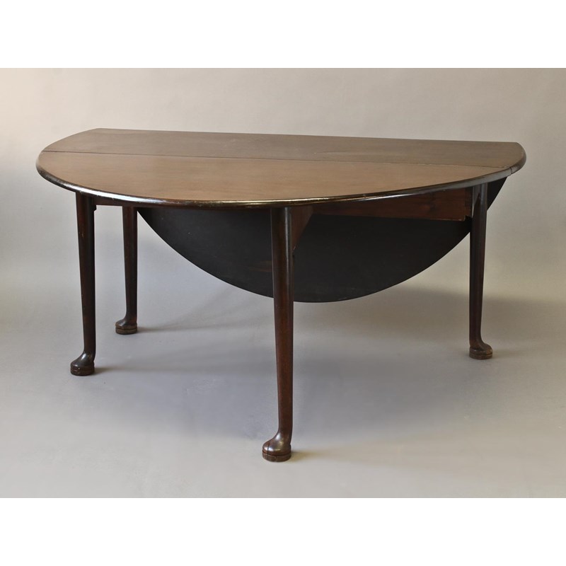 A GEORGE III MAHOGANY DROP FLAP DINING TABLE, the oval drop flap top on four turned tapering legs with pad feet, 71cm high, the top 142cm x 153cm (open).