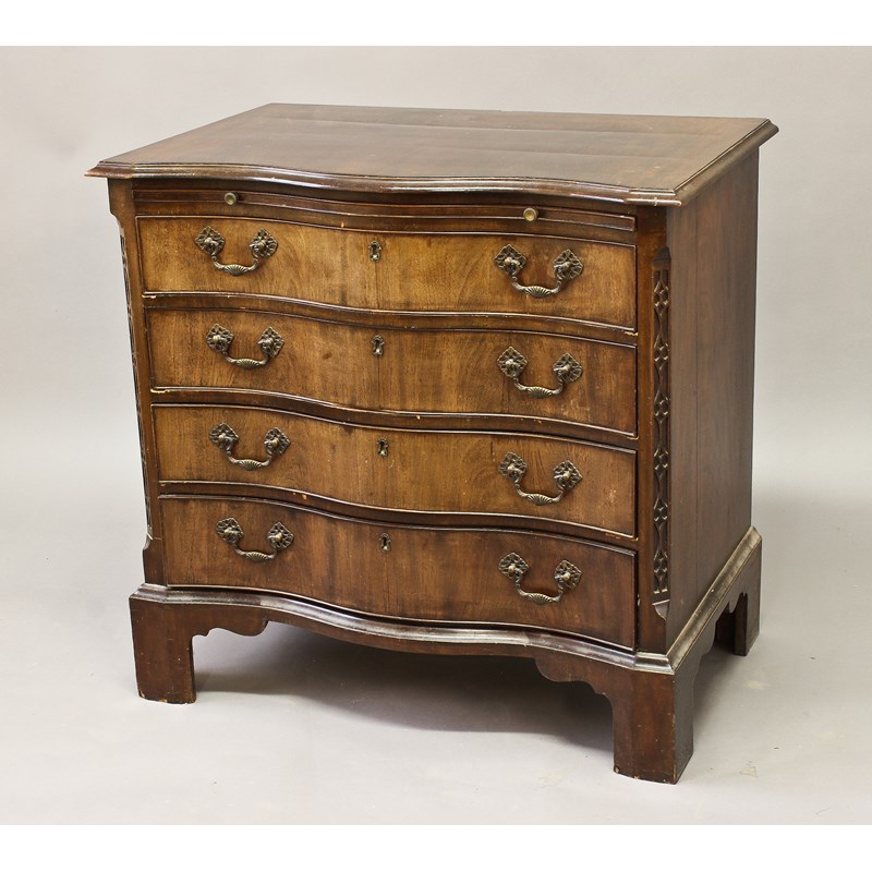 A GEORGE III STYLE MAHOGANY SERPENTINE FRONTED CHEST, the shaped top with a moulded border above a brushing slide and four long graduated drawers between canted corners with blind fret decoration, on tall bracket feet, 85cm high x 89cm wide.