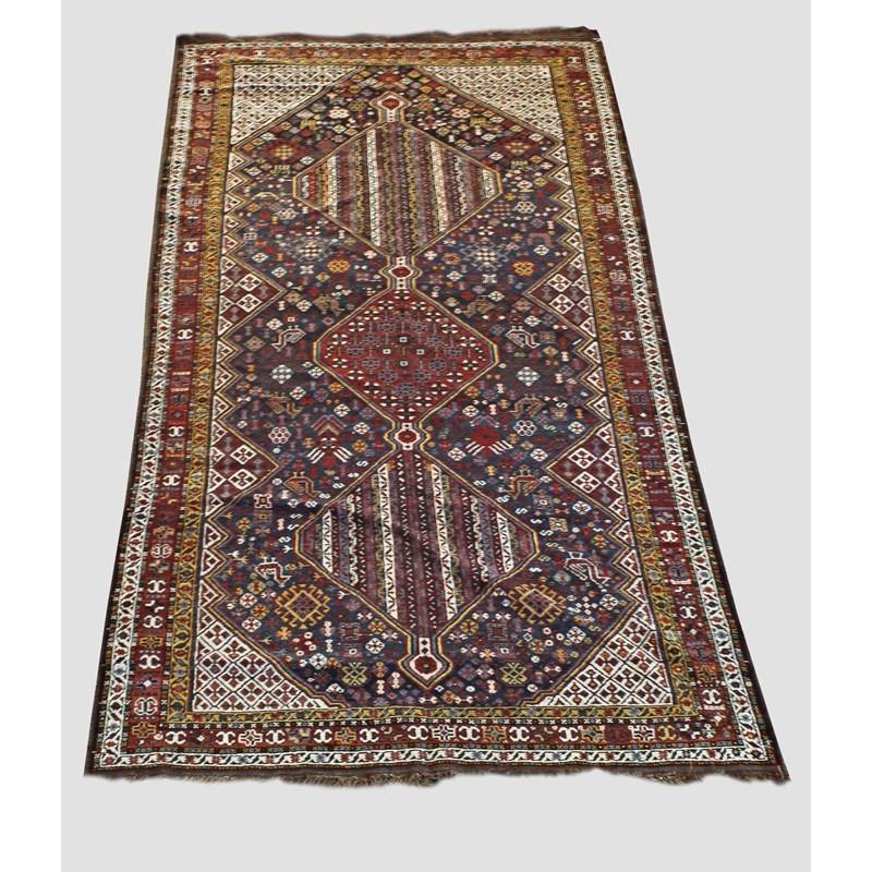 Fars, South West Iran, circa 1910. The indigo field of tribal and zoomorphic devices around three diamond medallions containing narrow polychrome columns enclosed by ivory lattice spandrels and narrow borders of hooked motifs flanked by pale lemon and ivory guard stripes, 322cm x 170cm.
