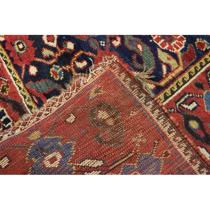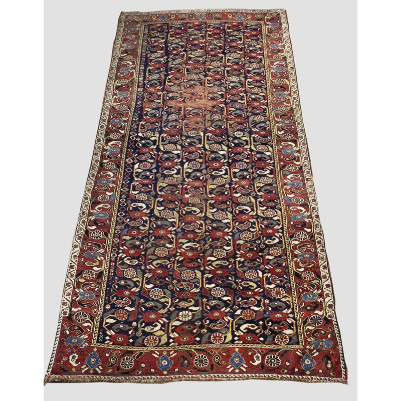 South West Iran, second half 19thC. The indigo field with narrow columns of stylised meandering polychrome vines enclosed by madder borders of boteh and polychrome flower heads and vines flanked by an outer guard stripe, 275cm x 140cm.