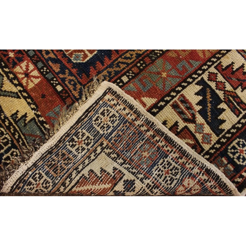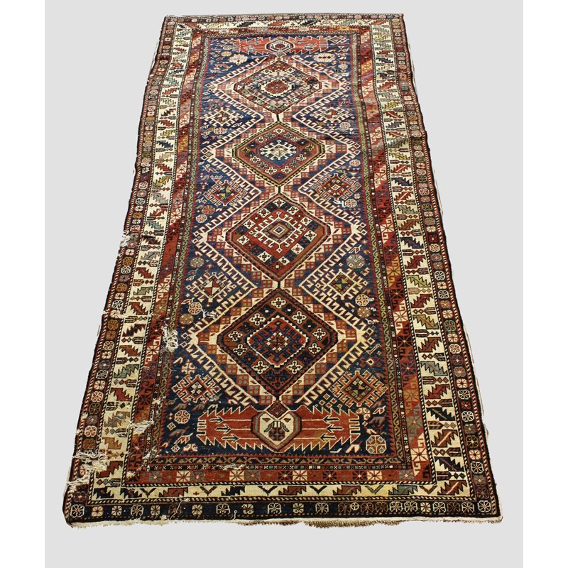 North East Caucasus, circa 1880. The indigo field with a column of stepped latch hook medallions surrounded by tribal devices and two madder serrated panels to either end enclosed by ivory leaf and calyx borders flanked by guard stripes, 322 x 162cm.