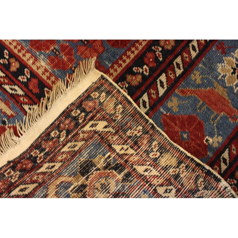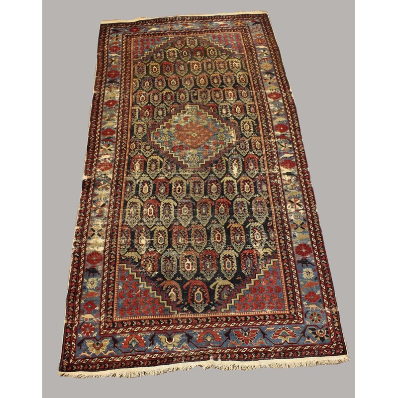 South West Caucasus, circa 1900. The midnight blue field of boteh around a stepped medallion framed by spandrels and sky blue borders of meandering vines, 304cm x 132cm.