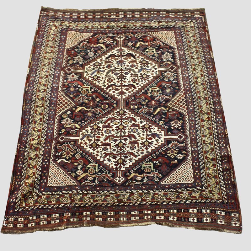 Fars, South West Iran, circa 1890. The midnight blue field with birds and tribal devices around two ivory stepped medallions framed by lattice spandrels and narrow pale lemon borders flanked by barber poles, 187cm x 144cm.