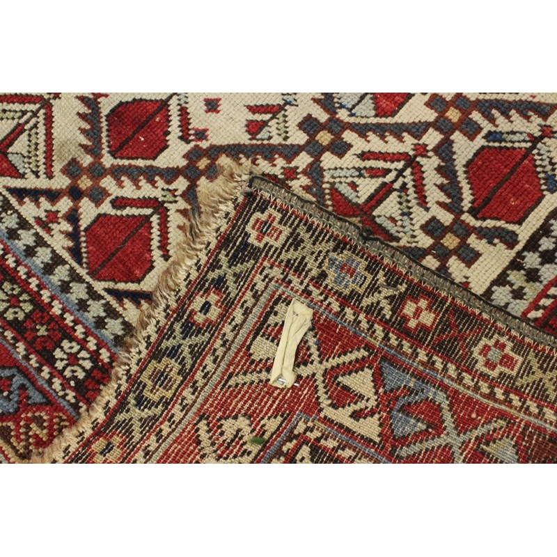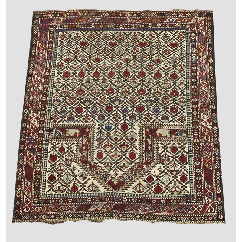 East Caucasus, late 19th Century. The ivory serrated lattice field with stylised plants beneath the Mihrab, the spandrels with further lattice work enclosed by narrow borders of reciprocal geometric motifs flower head guard stripes and barber poles, 140cm x 117cm.