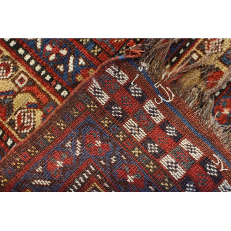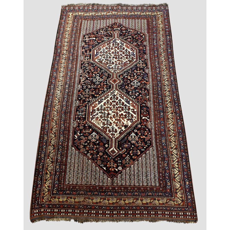Fars, South West Iran, circa 1890. The midnight blue field with birds animals and stylised plants around two ivory medallions framed by spandrels with narrow columns and pale lemon borders flanked by indigo guard stripes, chequered panels at each end, 305cm x 162cm.