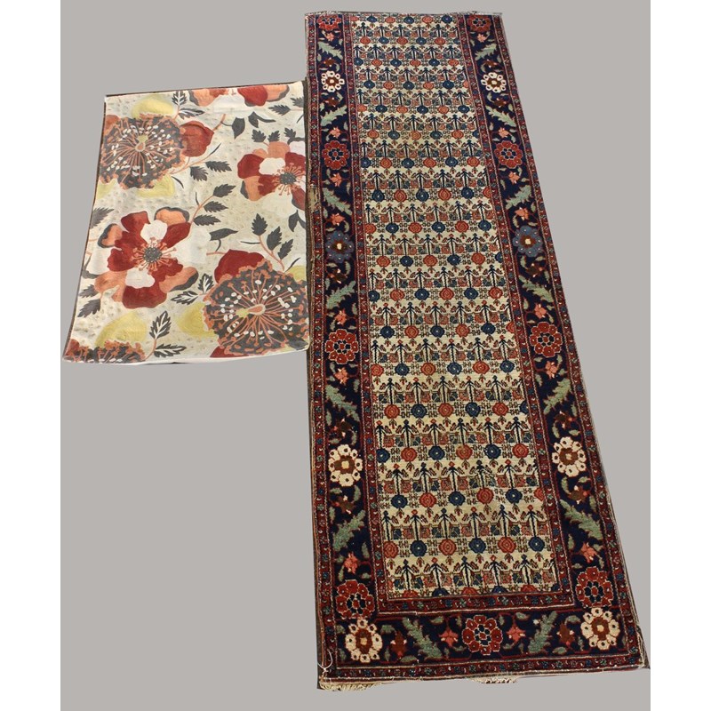 NORTH WEST PERSIAN RUNNER FRAGMENT, circa 1920. The ivory field with a one way design of polychrome stylised plants enclosed by meandering vine borders, 300cm x 94cm, together with a chain stitch rug (2)