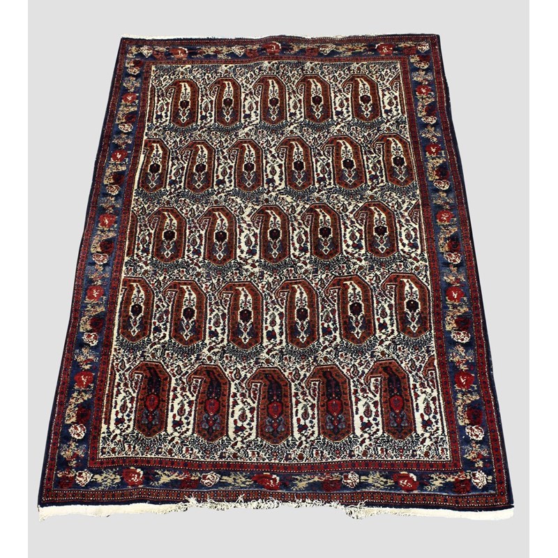 circa 1930. The ivory field of stylised angular boteh framed by indigo borders of naturalistic roses flanked by guard stripes, 211cm x 142cm.