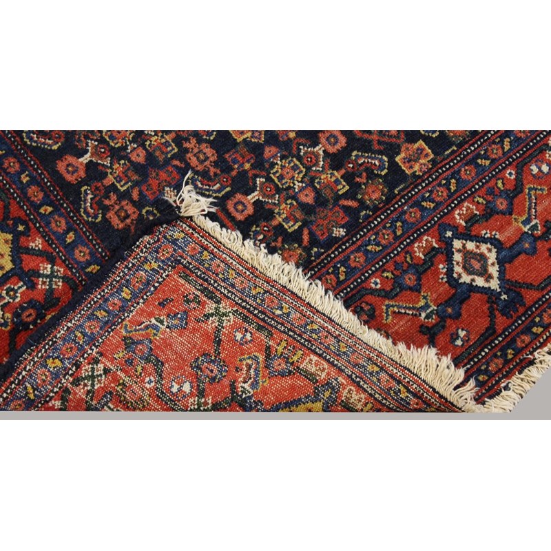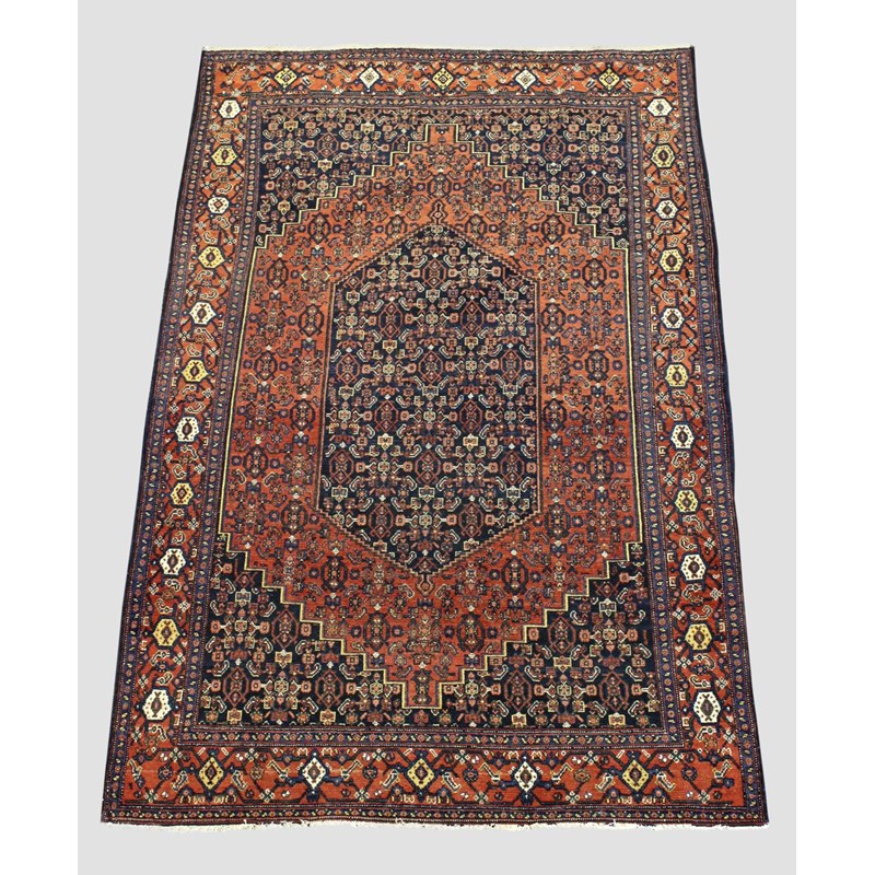 Iranian Kurdistan, circa 1930. The madder field of Herati design centred by a similar indigo lozenge framed by borders of octagons and stylised vine borders flanked by sky blue guard stripes, 192cm by 134cm.