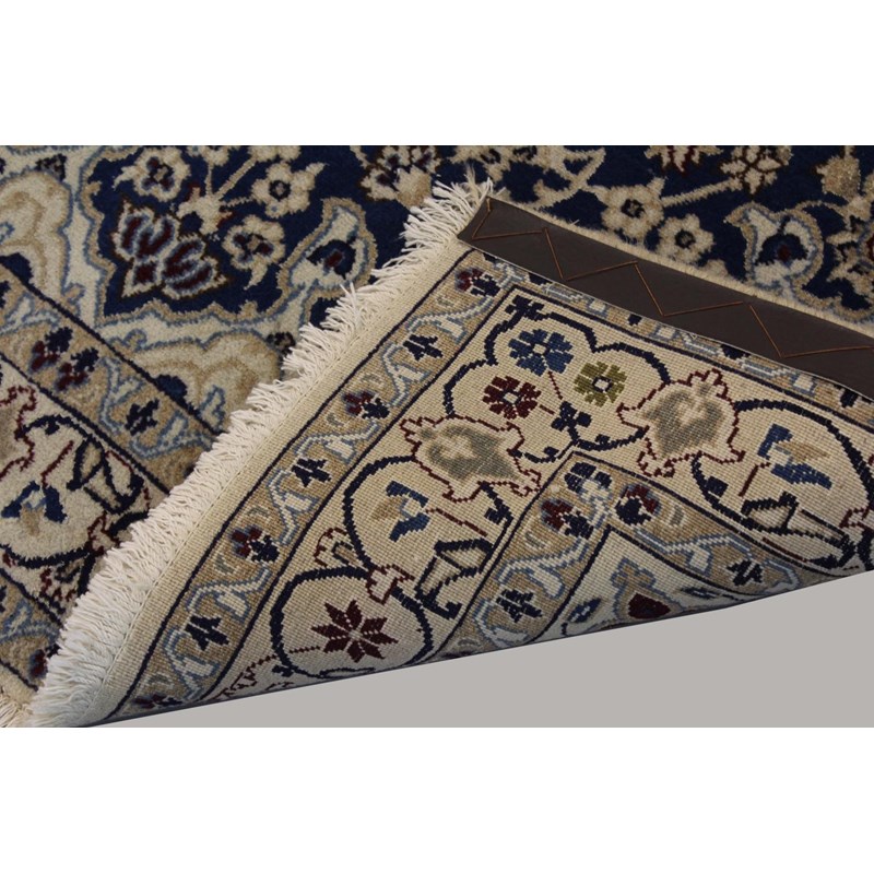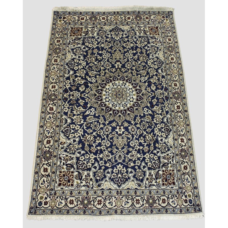 Central Iran, circa 1970. The indigo field of floral vines around a flower head medallion framed by spandrels and borders of palmettes and meandering vines flanked by guard stripes, 202cm x 128cm.