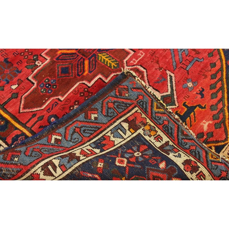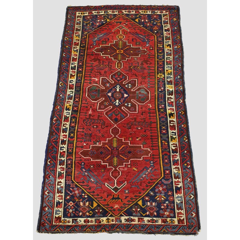 East Caucasus, circa 1910. The brick red elongated lozenge field of tribal and zoomorphic devices around three medallions framed by spandrels and narrow ivory borders flanked by running dong guard stripes, 213cm x 108cm.