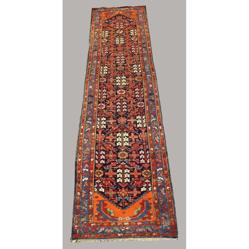 HAMADAN RUNNER, Iranian Kurdistan, circa 1910. The deep indigo field of gol henna design enclosed by triple narrow borders, 398cm x 101cm.
