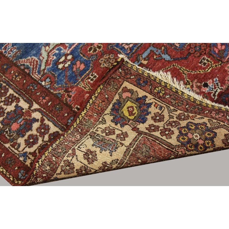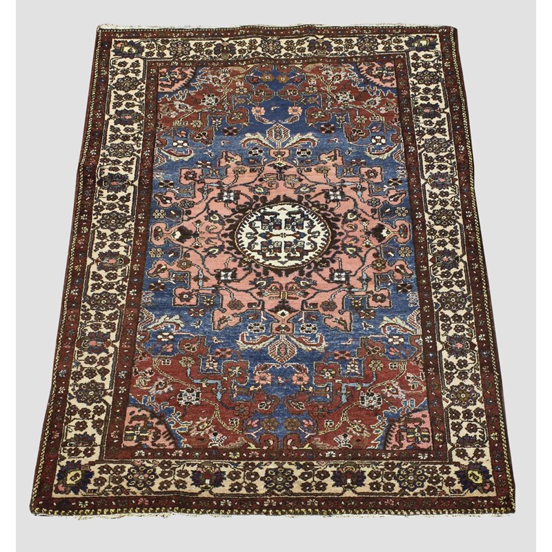 TAFRESH RUG, Iranian Kurdistan, circa 1925. The sky blue field centred by a cream and salmon pink medallion framed by madder spandrels and ivory borders of meandering floral vines flanked by guard stripes, 187cm x 130cm.