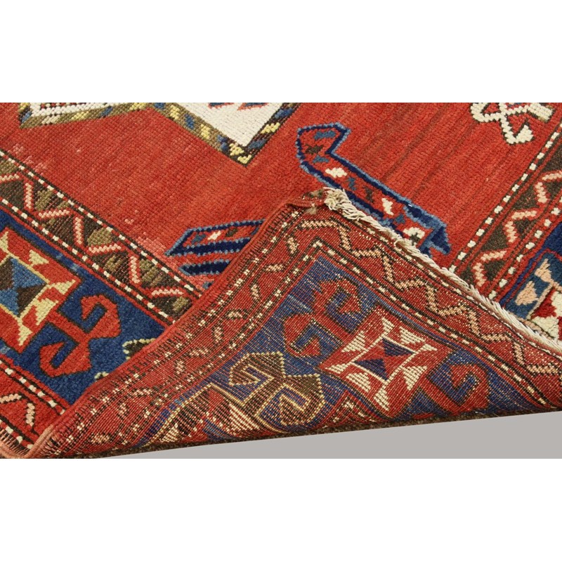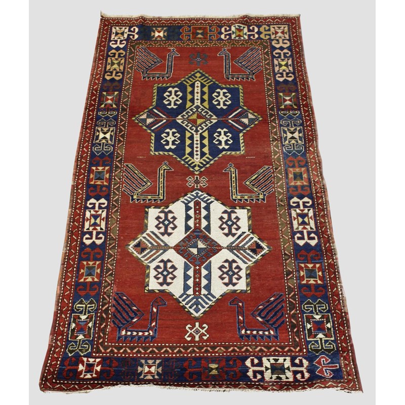 Central Caucasus, circa 1900. The madder field with indigo and ivory stellar medallions flanked by fan tailed stylised birds enclosed by indigo borders of hooked devices, barber poles and guard stripes, 233cm x 121cm.