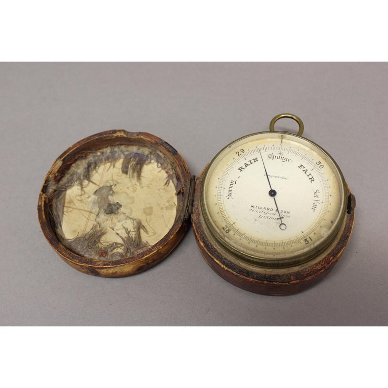 A Victorian mahogany pocket barometer by Millard and Sons, the silvered dial 'Millard & Son, 245 Oxford Street, London, 6.7cm wide, in a fitted leather travelling case.