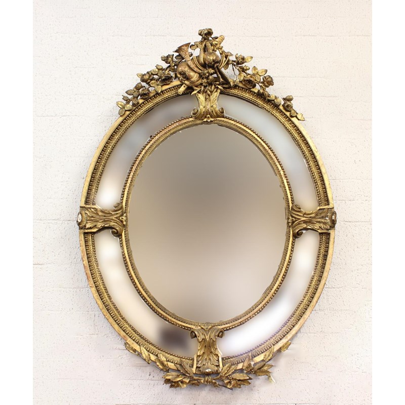 A gilt framed wall mirror with a central bevel edged mirror plate flanked by four flanking plates within carved gesso surrounds, surmounted by a musical trophy and floral garlands, 120 x 87cm.