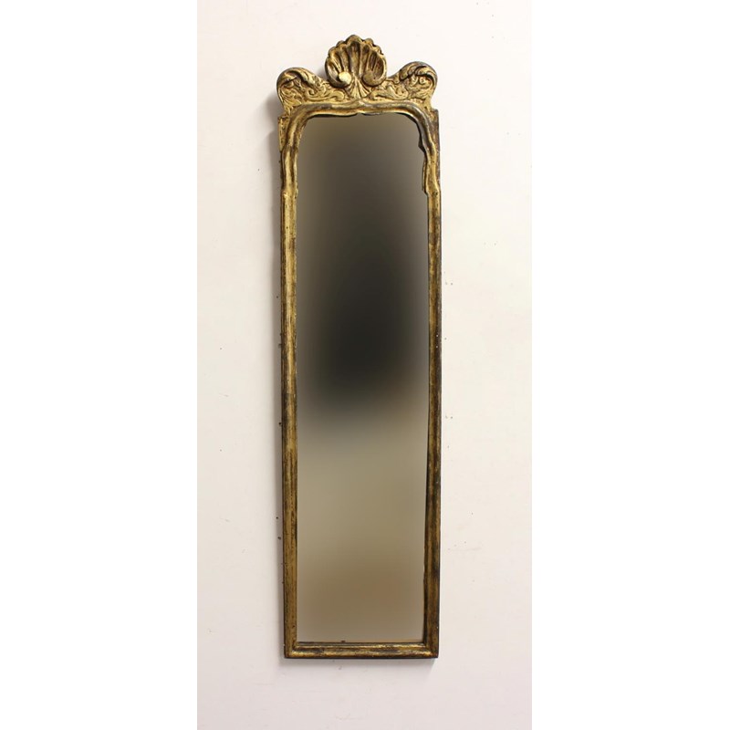 A narrow rectangular wall mirror with a two part bevel edged plate within a gilt moulded surround with shell and leaf cresting, 109cm high, 28cm wide.