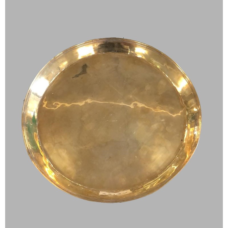 AN EARLY 18TH CENTURY BRASS DISH. An English brass dish of circular form with raised rim with incised line decoration, 26cm wide, 1.5cm high.