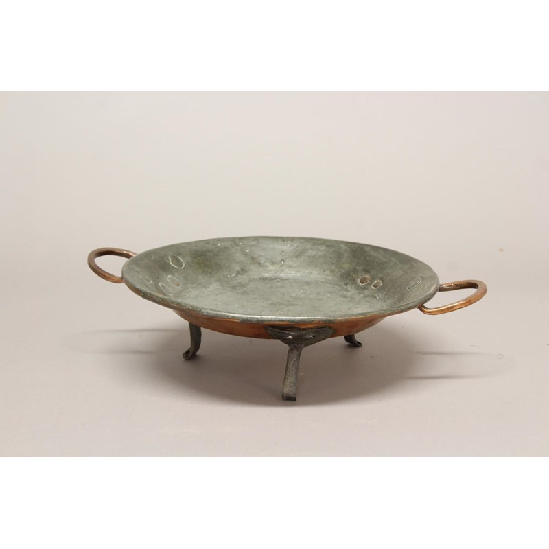 A circular French baking dish with twin carrying handles and three short scrolling legs, stamped LcSI and with crowned C mark, a duty mark used to show that the duty imposed on metalwork had been paid. This mark was only used between 1745-49. 10cm high, 42cm wide