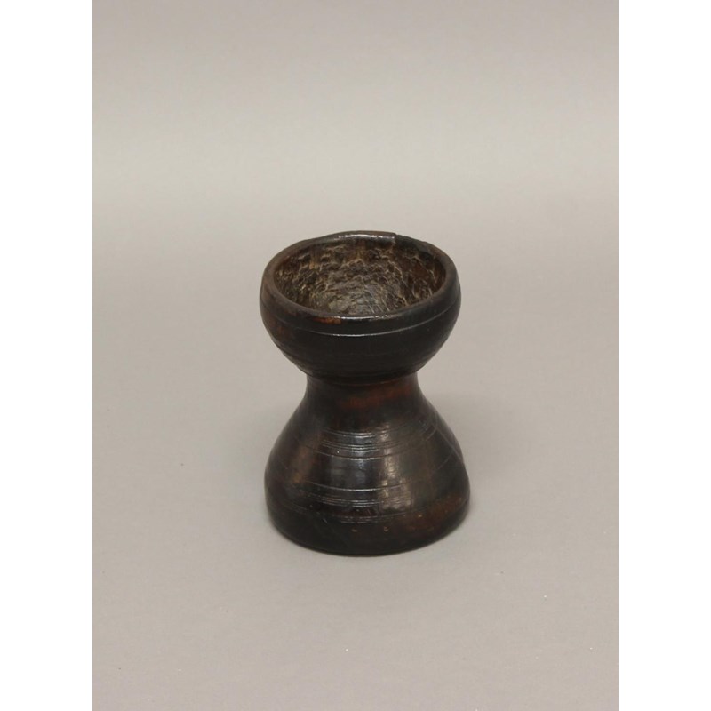 AN 18TH CENTURY TURNED TREEN MORTAR. A turned wooden mortar of waisted cylindrical form with ring decoration, 16.5cm high, 12.5cm wide.