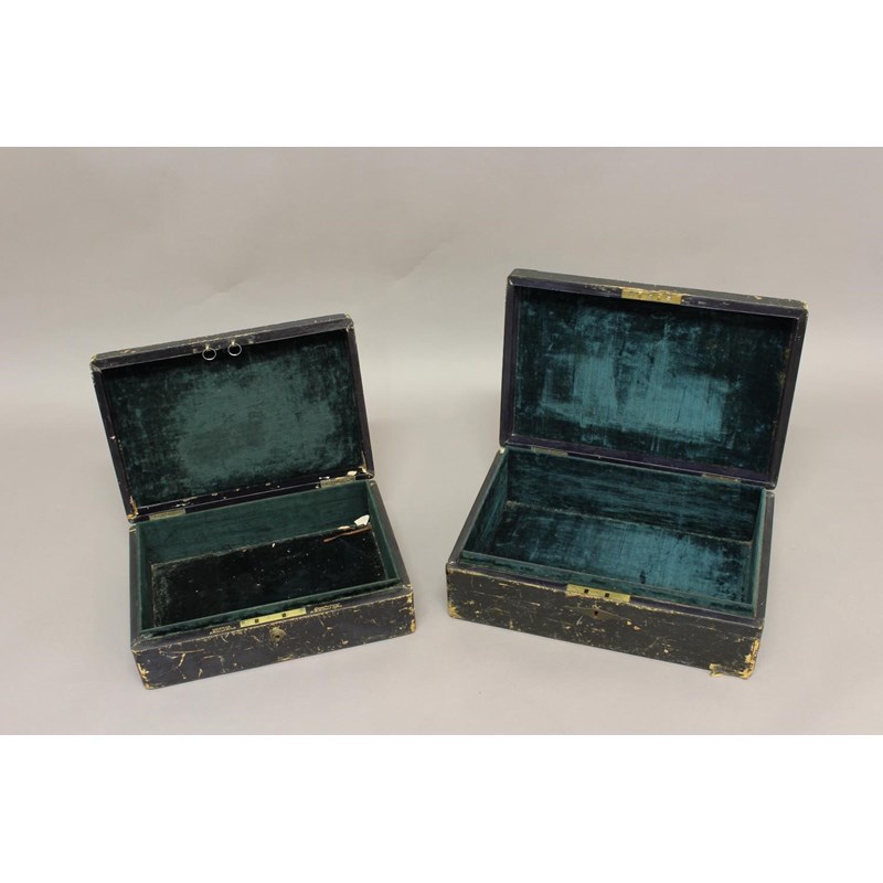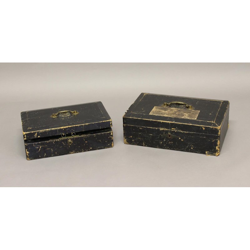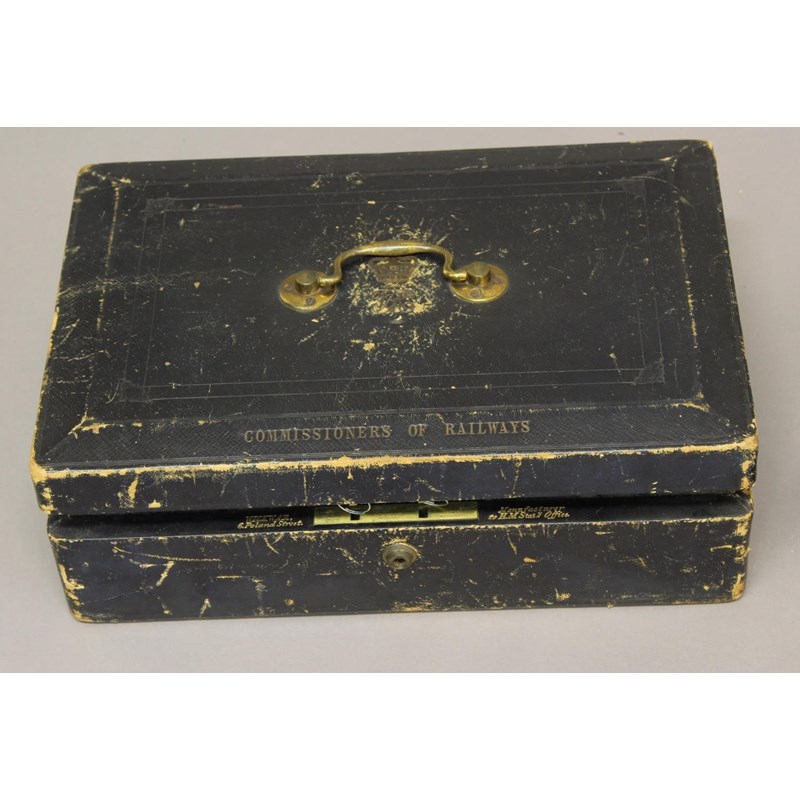 Two similar leather covered secure document cases, one by Wickwar of 6 Poland Street, marked with VR and a Crown and 'Commissioners of Railways' 41cm wide 12cm high and 28cm deep. The other with a paper label 'Captain Douglas Galton, Royal Engineer', 16cm high 46cm wide and 31cm deep. (2)