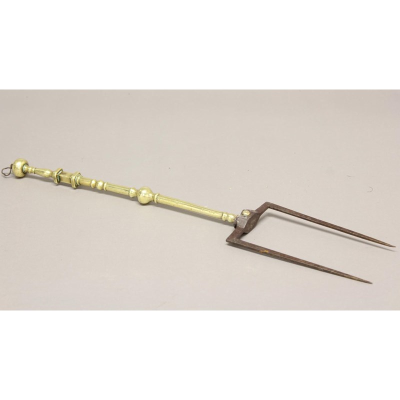 An unusual toasting or roasting fork with twin pointed prongs on a decorative turned brass handle, 52cm long, 9cm wide.