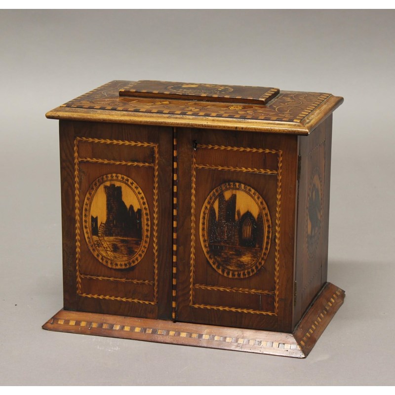 The cabinet with twin doors beneath a rising stepped top, the interior fitted with three drawers, all veneered in typical Kilarney fashion with shamrocks, harp and romantic ruins, 26cm high, 30cm wide and 20cm deep.