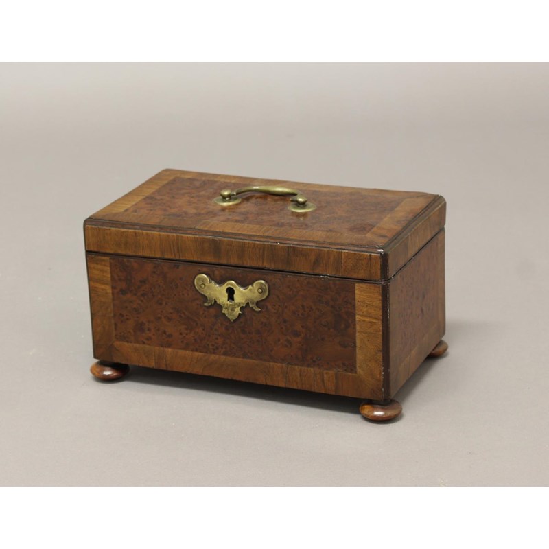 A GEORGE II BURRWOOD TEA CADDY, with a three section interior, on bun feet, height 15cm, width 28cm, depth 17cm