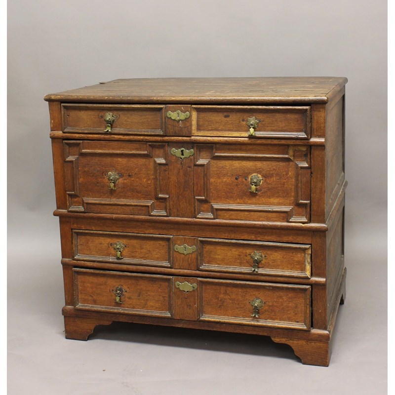 AN OAK CHEST OF DRAWERS, late 17th/early 18th century, with four panelled long drawers on bracket feet, in two parts, height 87cm, width 94cm, depth 61cm