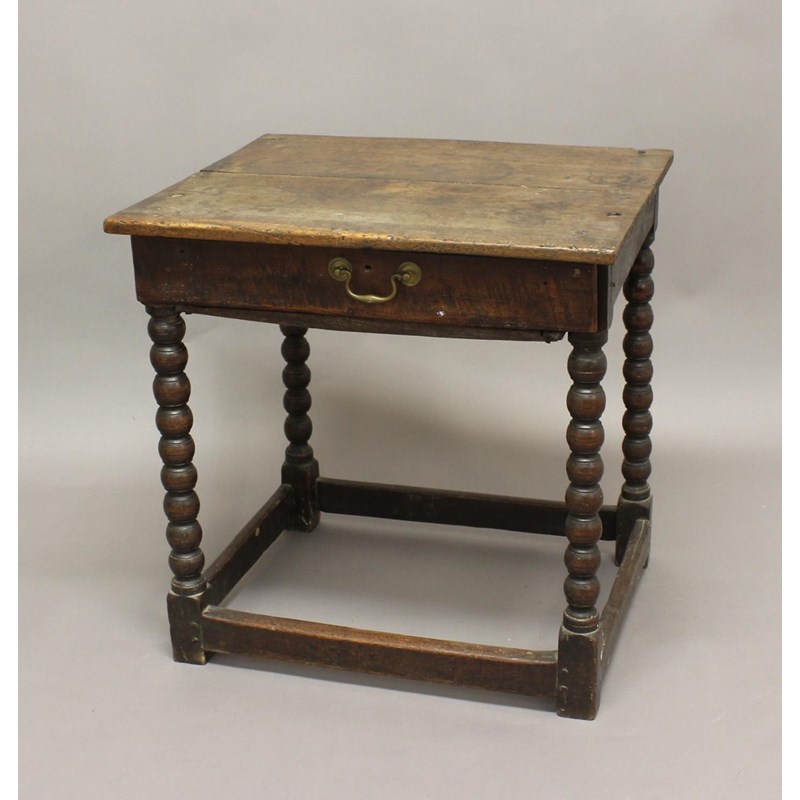 the rectangular top above a single drawer with offset handle on bobbin turned legs and box stretcher, height 66cm, width 66cm, depth 52cm