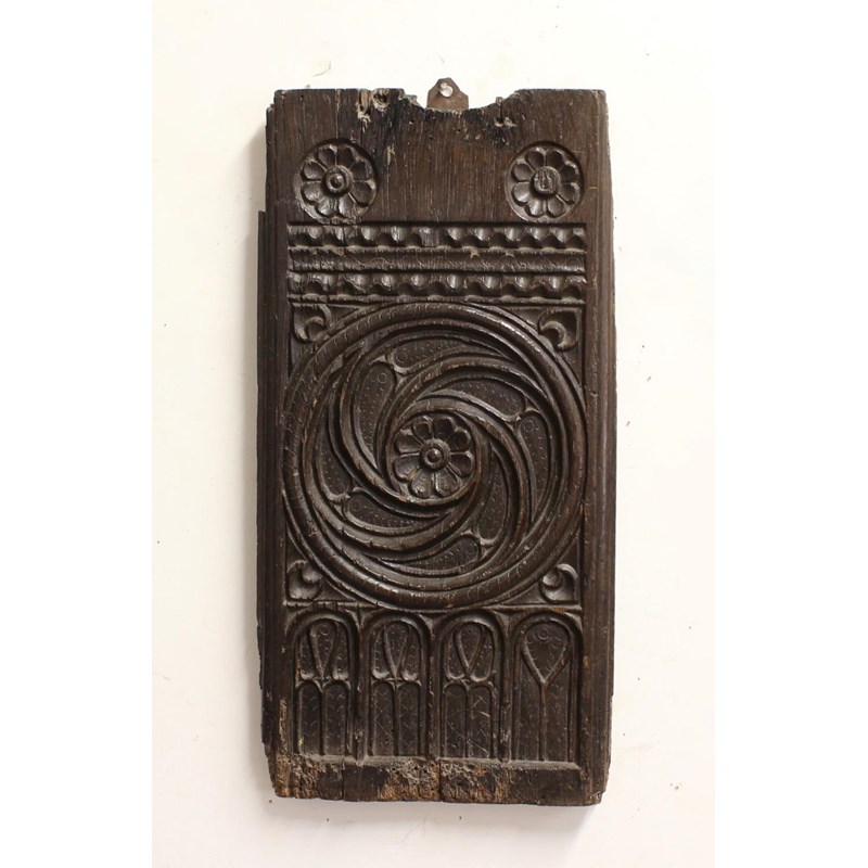 A rectangular section from a 16th century or earlier pew end, carved with a rose within gothic tracery and above similar arch-topped panels, 63cm high, 32cm wide and 3cm deep,