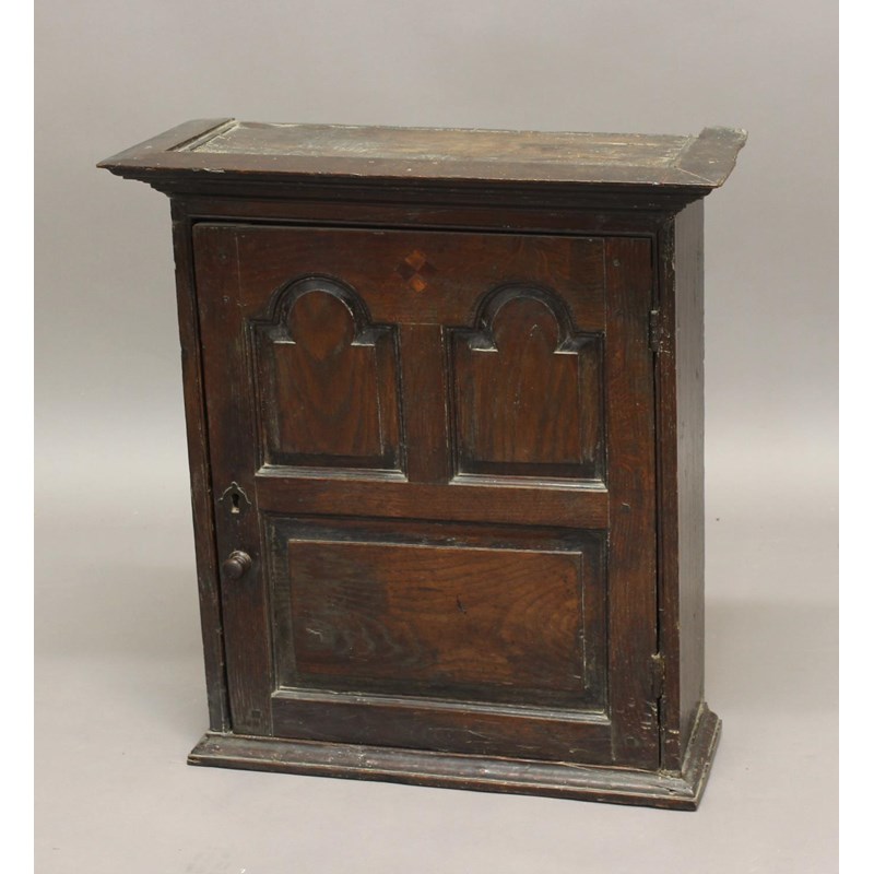 The door with two arched top and a rectangular fielded panel beneath a broad moulded cornice and enclosing a three shelf interior, height 68cm, width 64cm, depth 26cm
