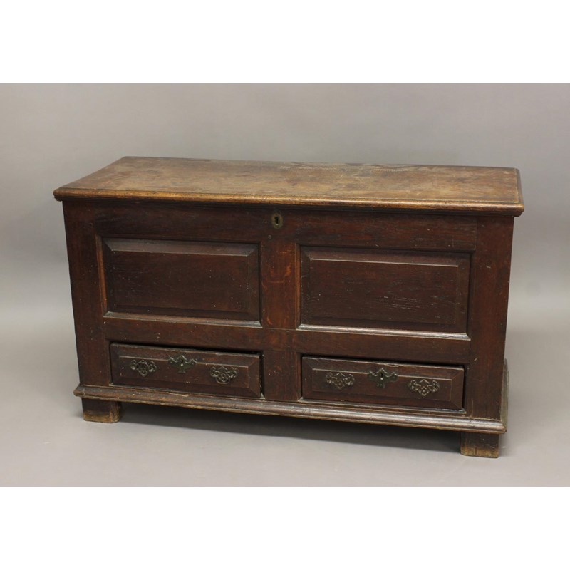 A GEORGE II OAK MULE CHEST. With a hinged rectangular lid with moulded border above a two panel front and two short drawers and applied moulding, on stile feet, 69cm high, the top 47 x 121cm.