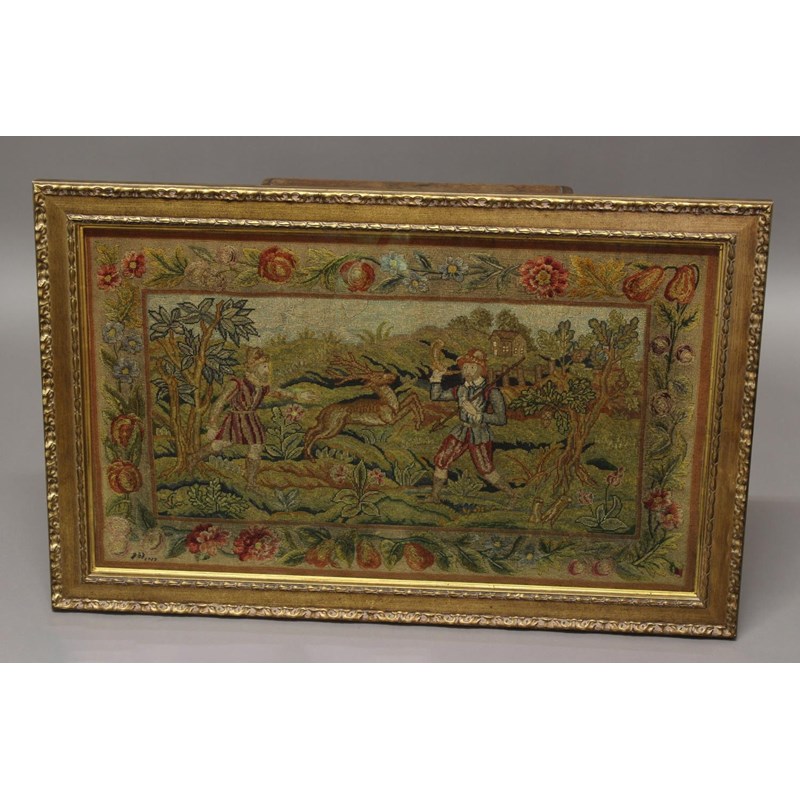 A needlework and tapestry panel of two huntsman and a stag in an idyllic landscape with a building to the distance, within a scrolling fruit and foliate border, framed and glazed, 57cm x 90cm overall.