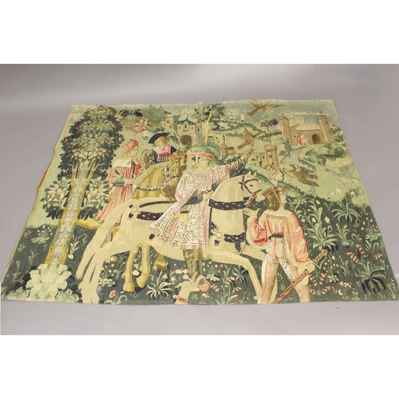 A wall hanging painted in tapestry effect with a substantial country house in a wooded landscape, the border with three roundels 'Foy Et Roy' 154 x 198cm. A similar panel painted in the 16th century tapestry manner with three men on horseback hunting with castles, trees and figures to the distance, 139 x 182 cm.
