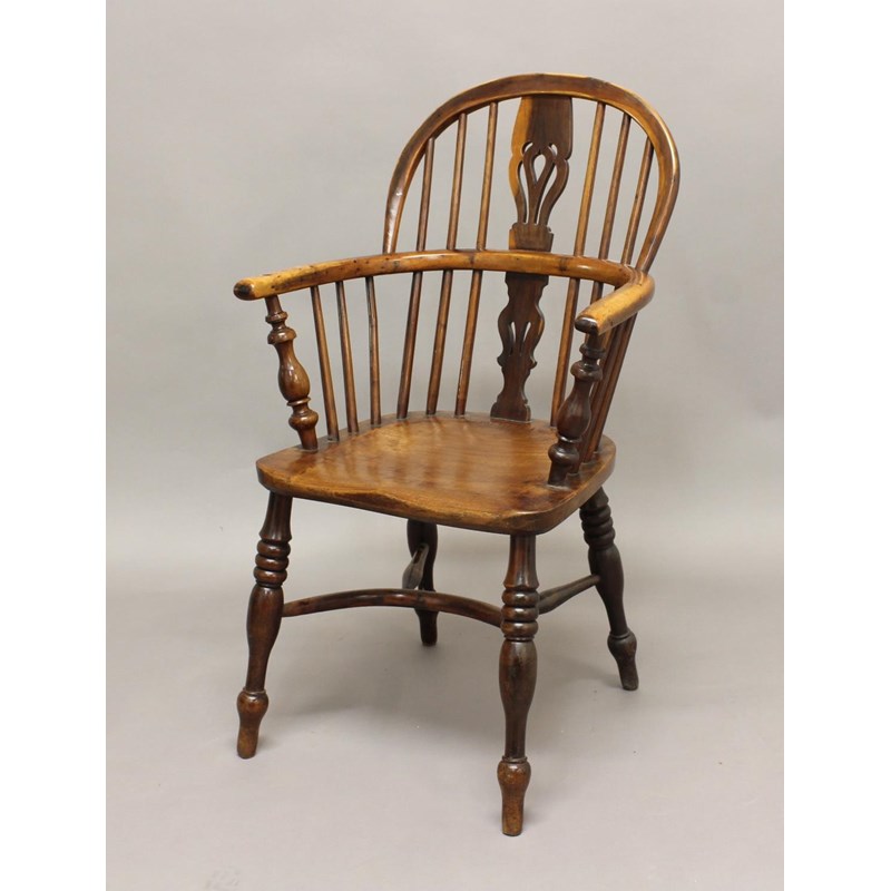 A YEW AND ELM WINDSOR CHAIR, the arched top above pierced vase shaped splat on turned supports with crinoline stretcher, height 95cm