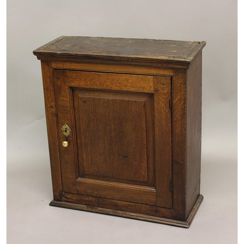 AN 18TH CENTURY OAK CUPBOARD, with panelled door, the interior with a single shelf, height 68cm, width 63cm, depth 26cm
