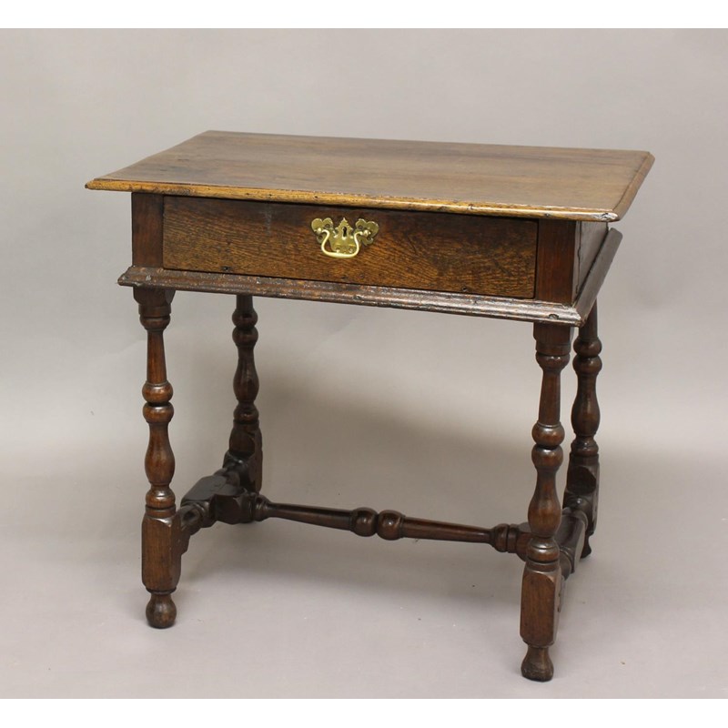 the rectangular top above single drawer on turned and block supports, with turned H stretcher, height 68cm, width 73cm, depth 47cm