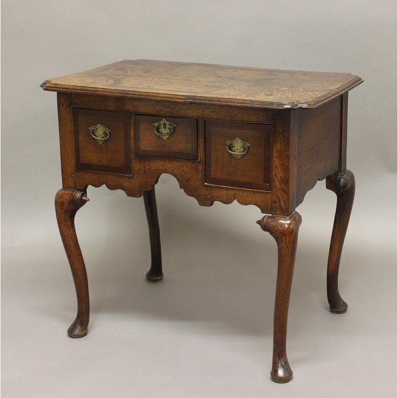AN 18TH CENTURY OAK LOWBOY, the inlaid shaped rectangular top above three drawers on a carved frieze, height 71cm, width 77cm, depth 51cm