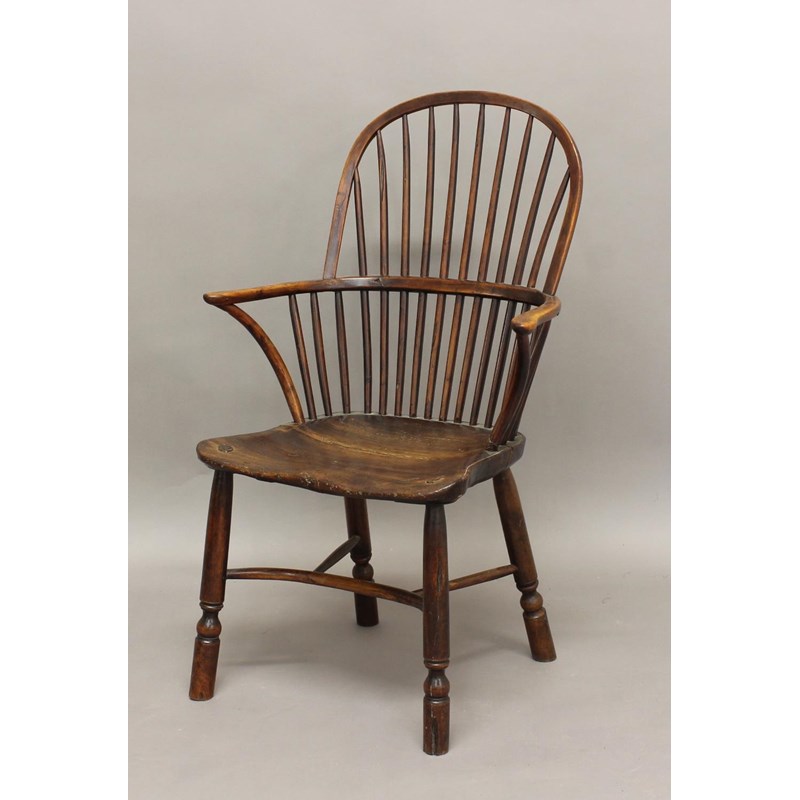 A YEW AND ELM WINDSOR CHAIR, the comb back above solid seat, turned legs and crinoline stretcher, height 101cm