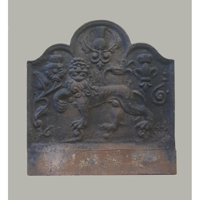 A fire back with arched top, decorated with a central lion passant surrounded by a rose, thistle and fleur de lys and date 1644. 82cm high, 78cm wide.