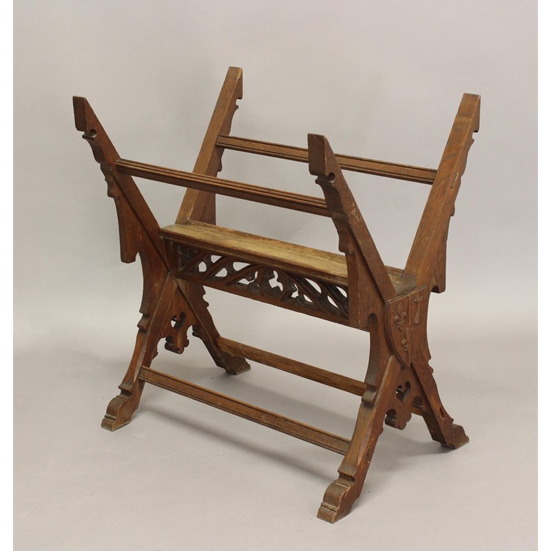 A 19th century oak folio stand the ends decorated with an armorial of fleur de lys halved with hanging sheaves, with a velvet covered folio with pierced metal strap mounts. Believed to be from the Chateau at Amboise in the Loire, a commission with which Viollet Le Duc was closely associated. The stand 72.5cm high, 68cm wide.