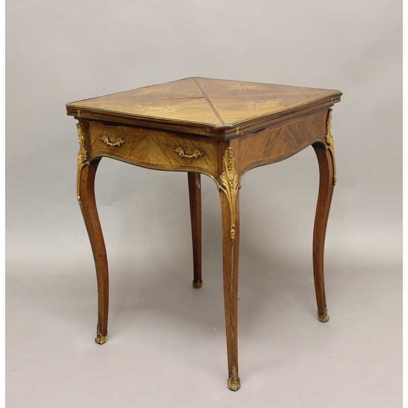with marquetry musical instrument inlay and ormolu mounts on slender cabriole legs, the frieze drawer stamped Edwards & Roberts, height 75cm, width 60cm
